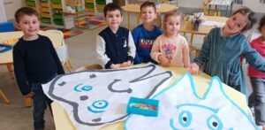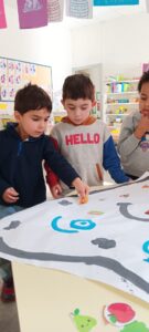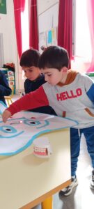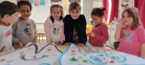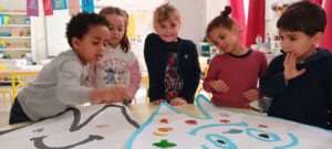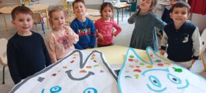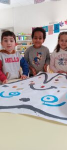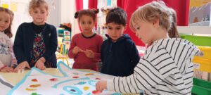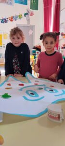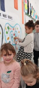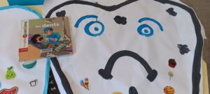 Nous avons joué avec le sablier de 3 minutes, la machoire … Nous avons appris une chanson ‘Comment se brosser les dents ?’ par exemple ….. et 3 minutes à se brosser les dents, c’est très long !!!