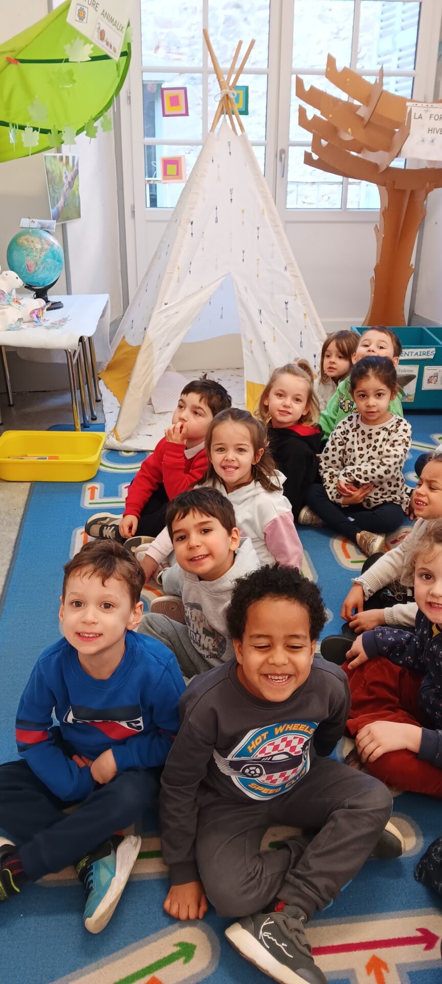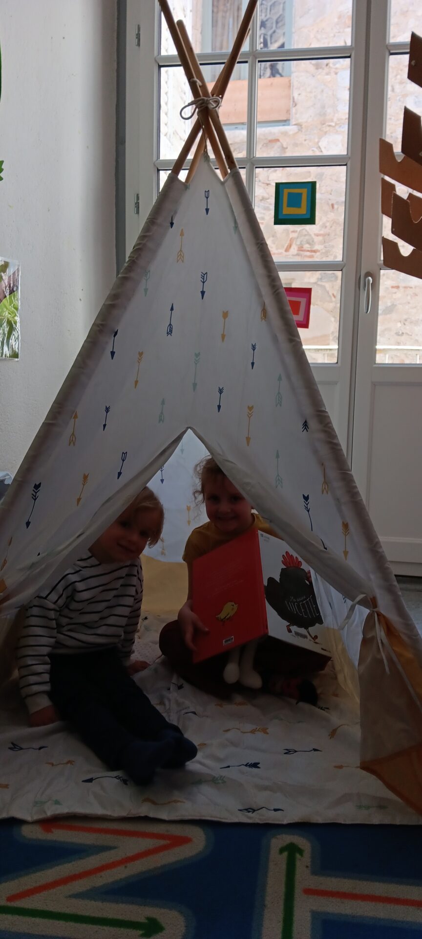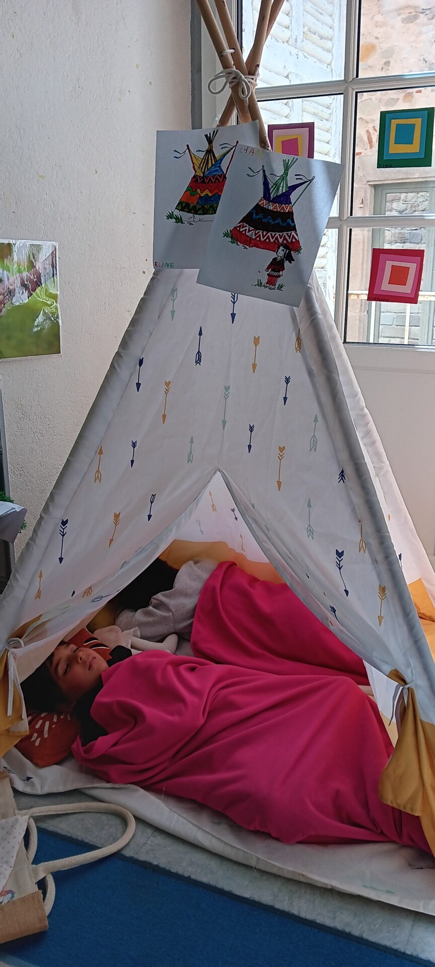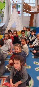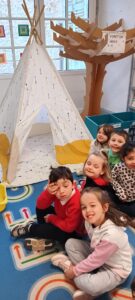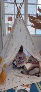 Un tipi vient d’être installé dans la salle de classe. Très apprécié rapidement… il est le terrain préféré pour lire un album, se reposer et parfois s’endormir !!!!, pour échanger en langue anglaise avec l’aide de la mascotte Pink Unicorn, pour explorer et commenter les découvertes du moment : les insectes du printemps notamment, pour s’isoler… Des petites règles d’utilisation ont été mises en place collectivement !!!