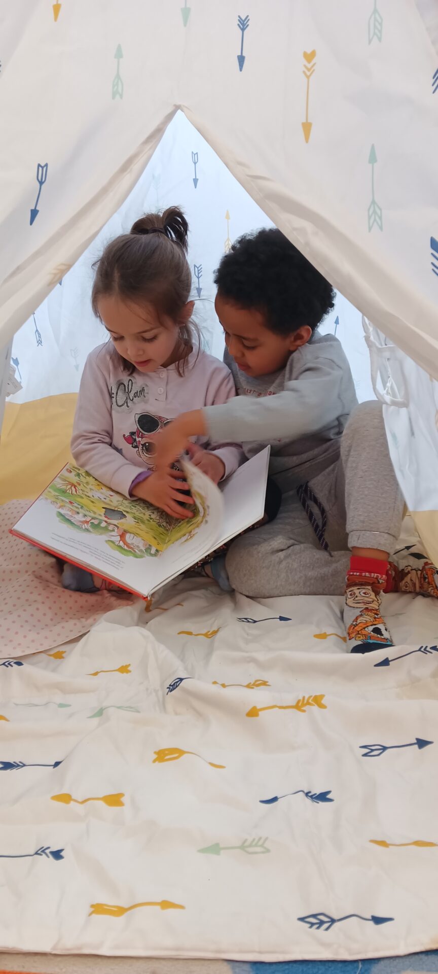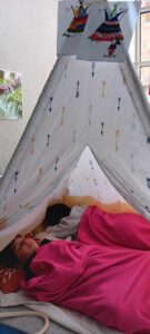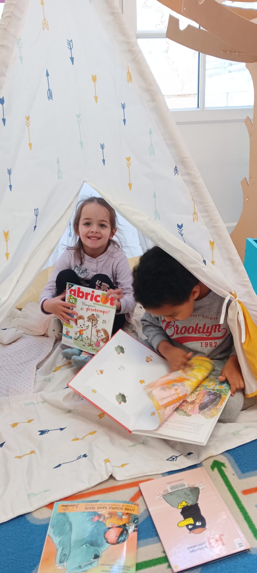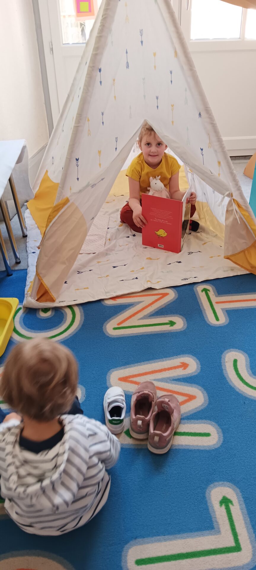 Un tipi vient d’être installé dans la salle de classe. Très apprécié rapidement… il est le terrain préféré pour lire un album, se reposer et parfois s’endormir !!!!, pour échanger en langue anglaise avec l’aide de la mascotte Pink Unicorn, pour explorer et commenter les découvertes du moment : les insectes du printemps notamment, pour s’isoler… Des petites règles d’utilisation ont été mises en place collectivement !!!